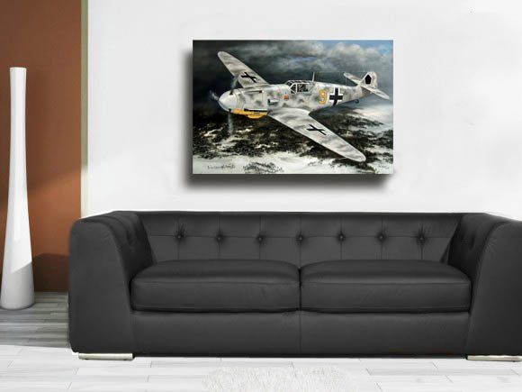 Auch von diesem Original Ölgemälde " Messerschmitt Bf 109 im Begleitschutz der Bismarck " biete ich über meinen Online Shop einen hochwertigen Leinwand Kunstdruck auf echter Leinwand und bereits auf Holzkeilrahmen aufgezogen ab 86,- Euro zum Kauf an.