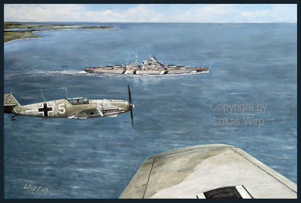 Begleitflug von zwei Messerschmitt BF 109 beim Auslaufen des Schlachtschiff Bismarck im Mai 1941 vor Gotenhafen. Diese sehr extravagante Sicht aus dem Cockpit einer BF 109 hat Militärmaler Lukas Wirp nach damaligen Originalfotos gestaltet und in Öl/Acryl auf Leinwand gemalt.