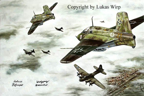 Messerschmitt BF109 der Luftwaffen Geschwader JG27 und JG54 im Luftkampf gegen amerikanische P51 Mustang. Das Original Ölgemälde wurde vom letzten noch lebenden Ritterkreuzträger der deutschen Luftwaffe, Leutnant Hugo Broch, persönlich signiert. Die Messerschmitt der beiden Geschwader in der Reichsverteidigung.