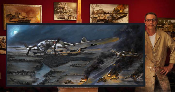 Großgemälde von Militärmaler Lukas Wirp über eine militärhistorisch sehr interessante Gegebenheit: Der Einsatz mehrerer deutscher Bombergeschwader in der Nacht vom 22. auf den 23. Juni 1944 auf den russische - US amerikanischen Flugplatz Poltawa in der Süd-Ostukraine. Während der Teheran Konferenz hatten Stalin und Roosevelt mit der Operation Frantic eine Zusammenarbeit der Luftwaffen beschlossen. Daraufhin wurden insgesamt 130 B-17 Bomber und andere US Flugzeuge auf zwei russischen Flugplätzen in der Süd-Ostukraine stationiert. Mit US Besatzungen und Bodenpersonal, wobei die Russen über die Einsatzziele mitbestimmen konnten. Als die deutsche Aufklärung davon Kenntnis erlangte, wurde der Angriff mehrerer deutscher Bombergeschwader auf den Flugplatz Poltawa befohlen. Insgesamt konnten bei diesem Einsatz 47 B-17 Bomber sowie weitere Flugzeuge (insgesamt 69 Stück) zerstört oder schwer beschädigt werden. Es war einer der letzten Erfolge der deutschen Luftwaffe im 2. Weltkrieg.
