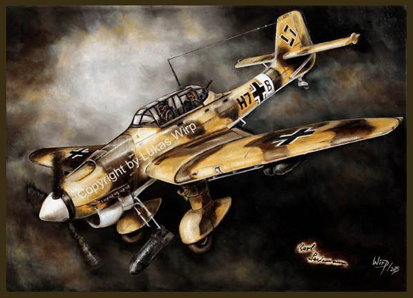 Das Gemälde von Militärmaler Lukas Wirp zeigt die Stuka vom SG77 in Ostfront Ausführung mit einem Adler im Sturzflug. Titel "Die Adler der Lüfte" Es ist eines der Tier-Kriegsgerät Serie des Malers, die es auch mit Motiven von Panzern und anderem Gerät mit Tiernamen und passendem Tier dazu gibt.